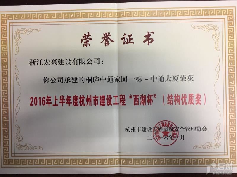 2016年10月我司榮獲上半年度杭州市建設(shè)工程“西湖杯”(結(jié)構(gòu)優(yōu)質(zhì)獎(jiǎng))。